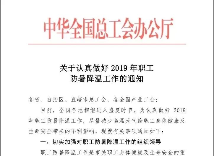 职工防暑降温工作是事关职工身体健康及生命安全的重要工作。目前,全国各地相继进入盛夏时节。为认真做好2019年职工防暑降温工作,尽量减少高温天气给职工身体健康及生命安全带来的不利影响,全国总工会已于日前下发《关于认真做好2019年职工防暑降温工作的通知》。